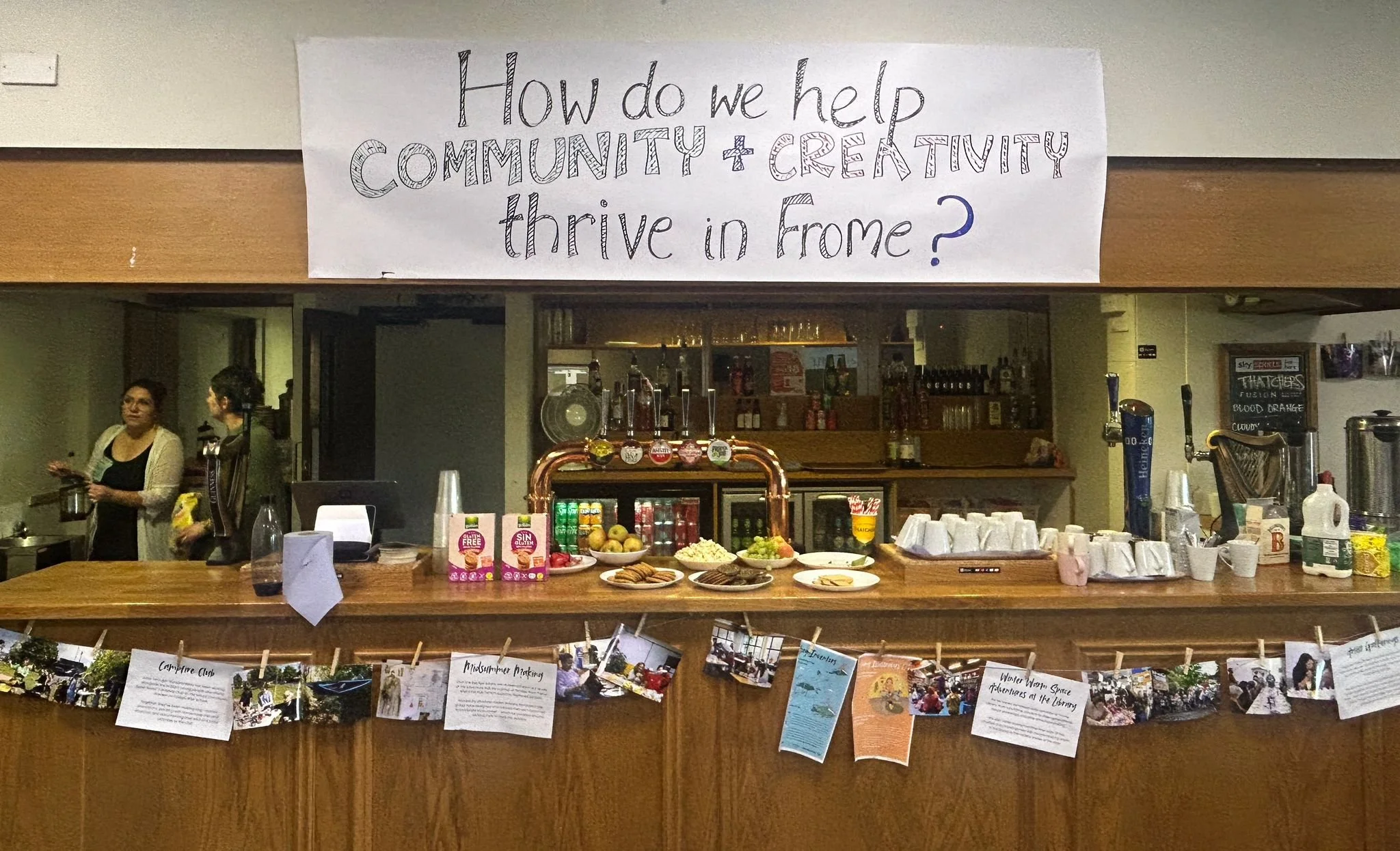 As part of our ongoing collaboration with Frome Town Council, we organised a large get-together for community groups across the town to explore how we can support local creativity to thrive. We were joined by artists, town councillors, sports groups, volunteers, academics, gardeners, photographers and more… We love using the ‘Open Space’ approach to running this kind of meeting, and we’re excited to see what emerges from this vibrant morning of discussion.
